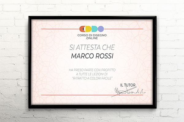Dopo aver completato tutte le lezioni di Ritratto a Colori Facile riceverai l’Attestato finale di partecipazione con il tuo nome e cognome, firmato dal maestro Marco Pescosolido.